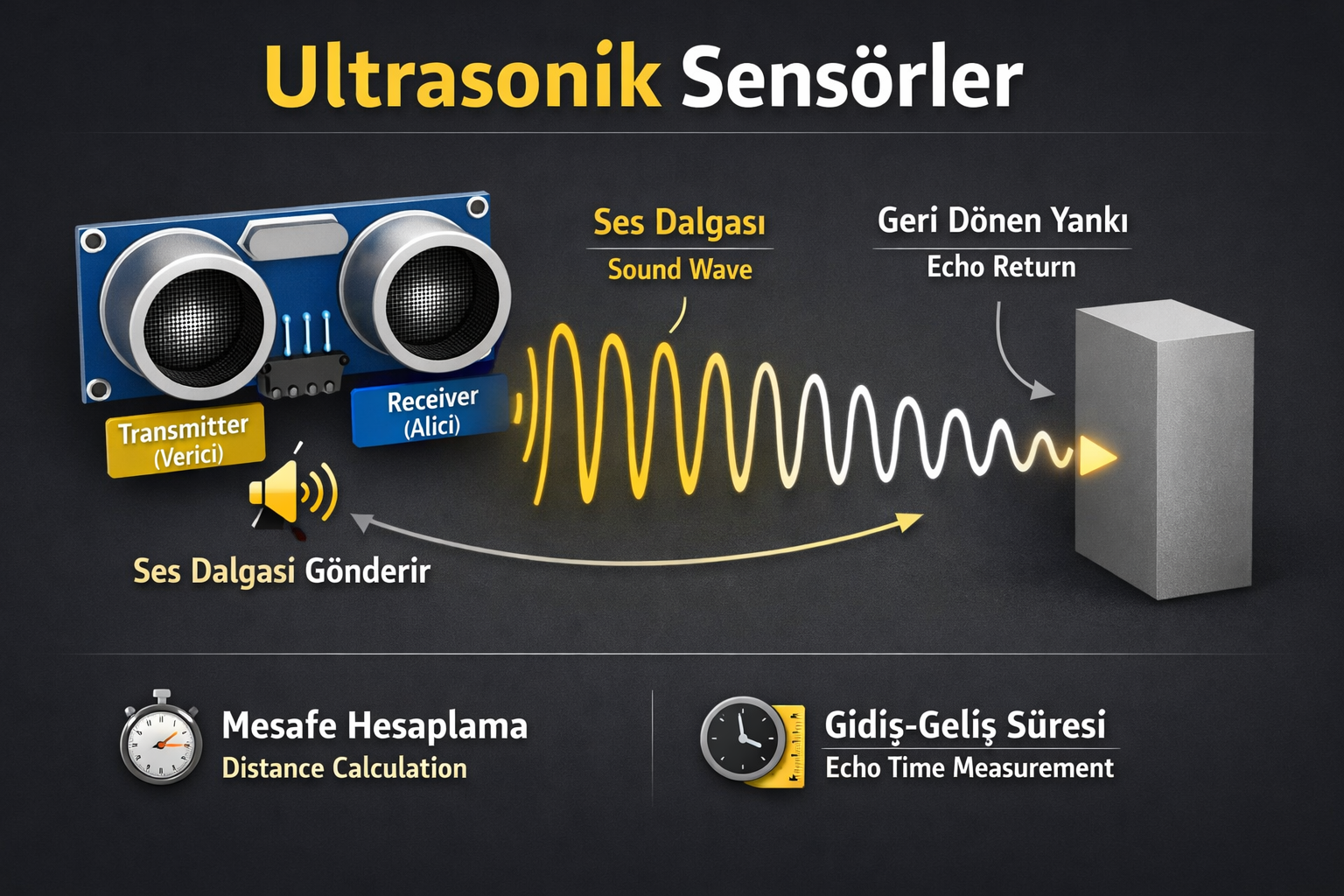 Ultrasonik sensörlerle ilk çalışmaya başladığımda en dikkatimi çeken şey mesafe ölçümünün netliği oldu. Sistem oldukça basit çalışıyor: sensör yüksek frekansta (genelde 40 kHz civarı) bir ses dalgası gönderiyor, bu dalga bir yüzeye çarpıp geri dönüyor ve geçen süreye göre mesafe hesaplanıyor.