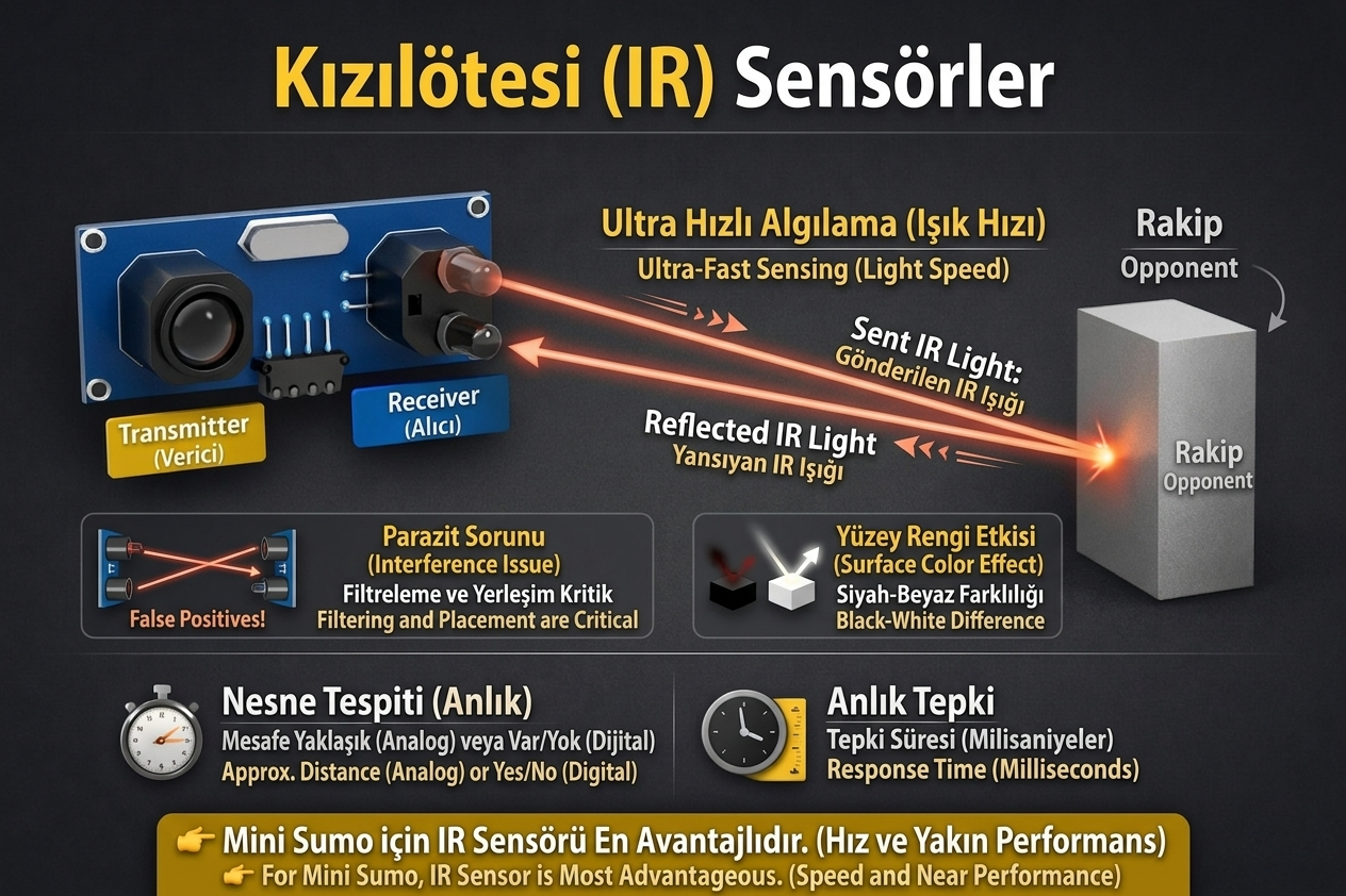 👉 Bu yüzden mini sumo robotlarda IR sensör kullanmak daha avantajlıdır.